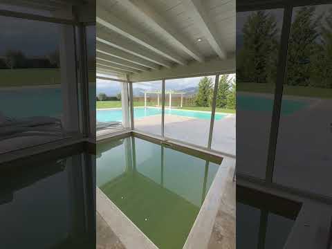 Esternamente il giardino di circa 2000 mq è corredato di piscina a sfioro corredata di pergolato in legno con tenda e zone relax mentre ulteriori 4000 mq sono lasciati a posteggio auto, terreno agricolo in previsione di eventuali campi da gioco o coltivazioni